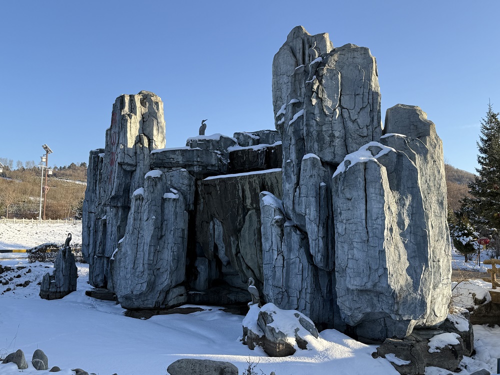 利用鋼筋混凝土直塑出的塑石假山景觀在冬天的場景 -